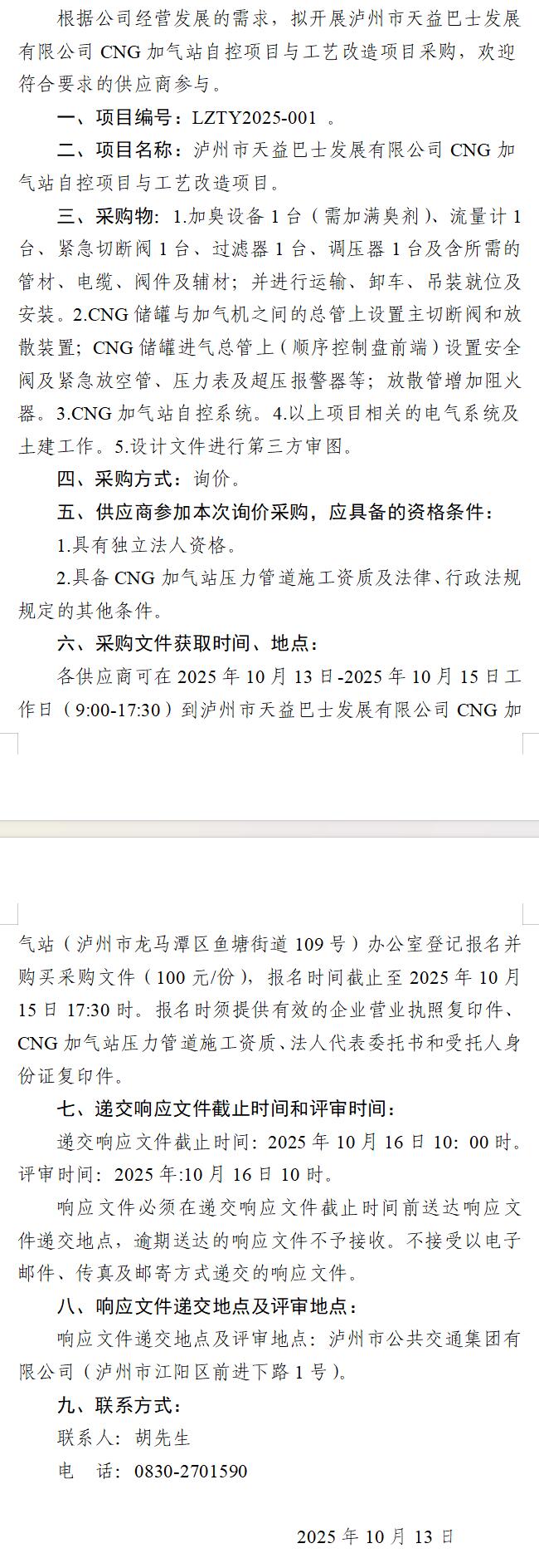 瀘州市天益巴士發(fā)展有限公司CNG加氣站自控項目與工藝改造項目采購公告